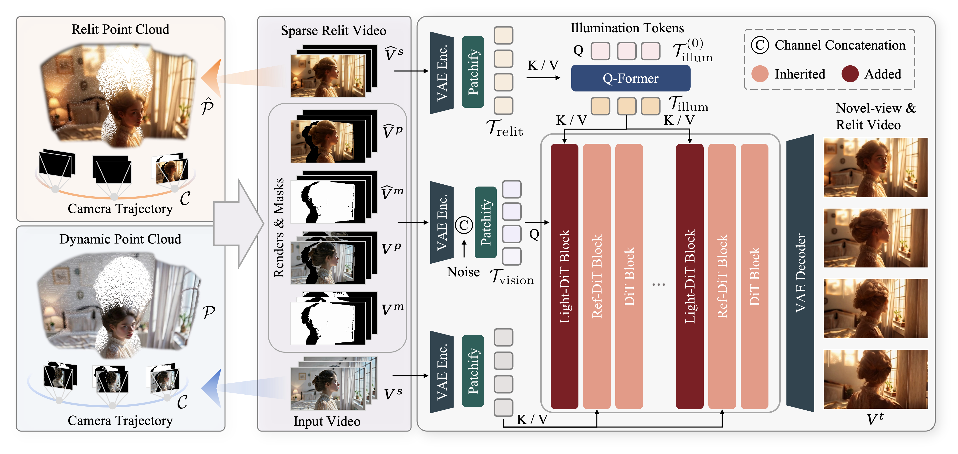 Overview of Light-X. Given an input video \( \mathbf{V}^s \), we first relight one frame with IC-Light, conditioned on a lighting text prompt, to obtain a sparse relit video \( \hat{\mathbf{V}}^s \). We then estimate depths to construct a dynamic point cloud \( \mathcal{P} \) from \( \mathbf{V}^s \) and a relit point cloud \( \hat{\mathcal{P}} \) from \( \hat{\mathbf{V}}^s \). Both point clouds are projected along a user-specified camera trajectory, producing geometry-aligned renders and masks \( (\mathbf{V}^p, \mathbf{V}^m) \) and \( (\hat{\mathbf{V}}^p, \hat{\mathbf{V}}^m) \). These six cues, together with illumination tokens extracted via a Q-Former, are fed into DiT blocks for conditional denoising. Finally, a VAE decoder reconstructs a high-fidelity video \( \mathbf{V}^t \) faithful to the target trajectory and illumination.